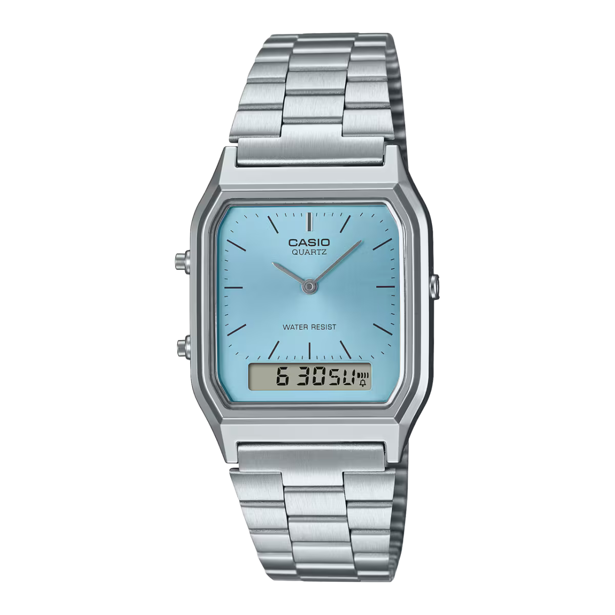 ساعة كلاسيكية ساحرة، بألوان عصرية. هيكلها الزاويّ يُحيط بمينا مُحدّث بأحدث صيحات الألوان. تجمع بساطة الماضي بين الأداء العصري والعملية العصرية في ساعة تناظرية مزودة بنافذة رقمية صغيرة تُتيح لك الوصول إلى المعلومات التي تحتاجها بسهولة. تصميم أنيق ومتعدد الاستخدامات يُكمل جميع المناسبات، من المناسبات الرسمية الأنيقة إلى النزهات غير الرسمية. اختر من بين ثلاثة ألوان رائعة: أزرق ثلجي، أزرق فيروزي، أو فضي