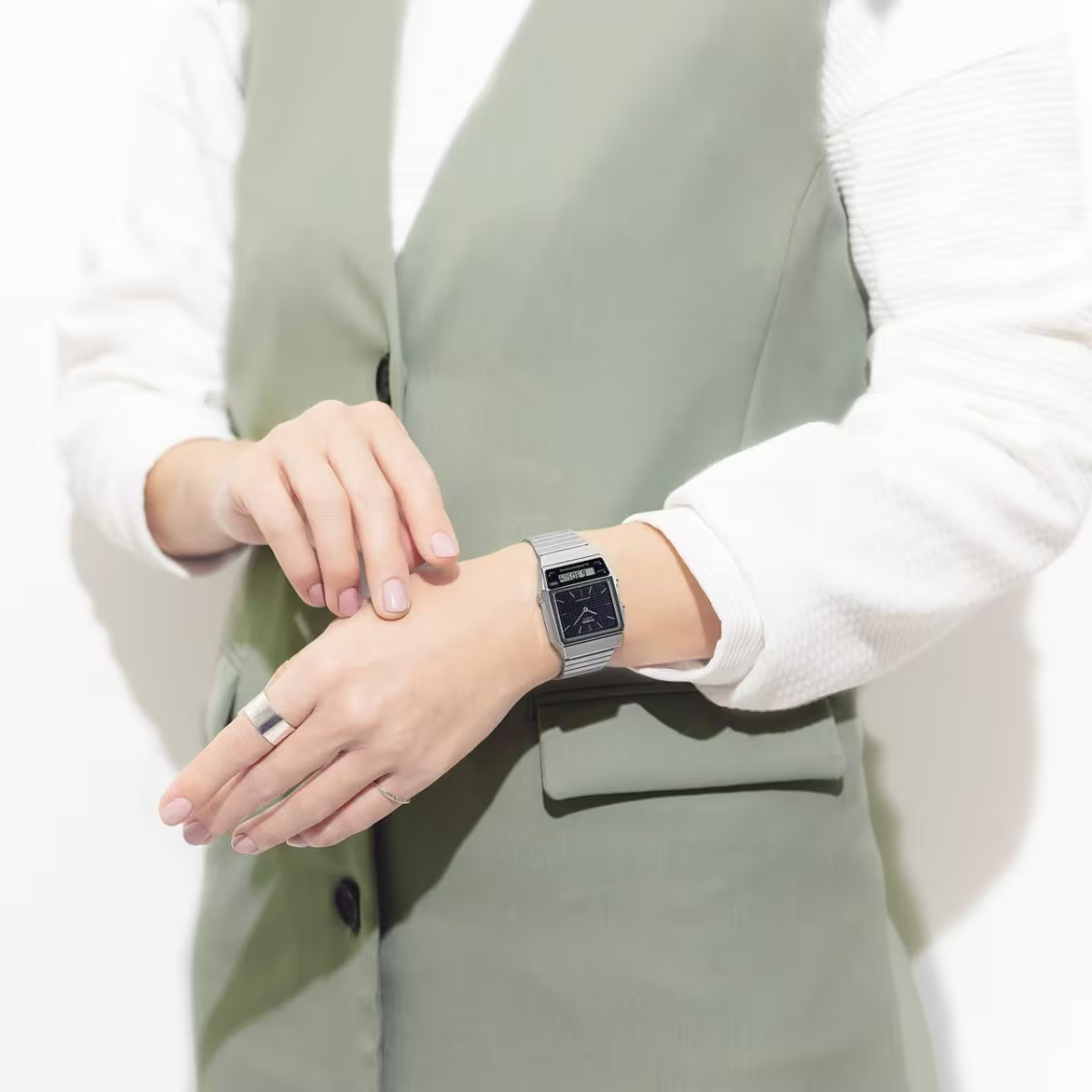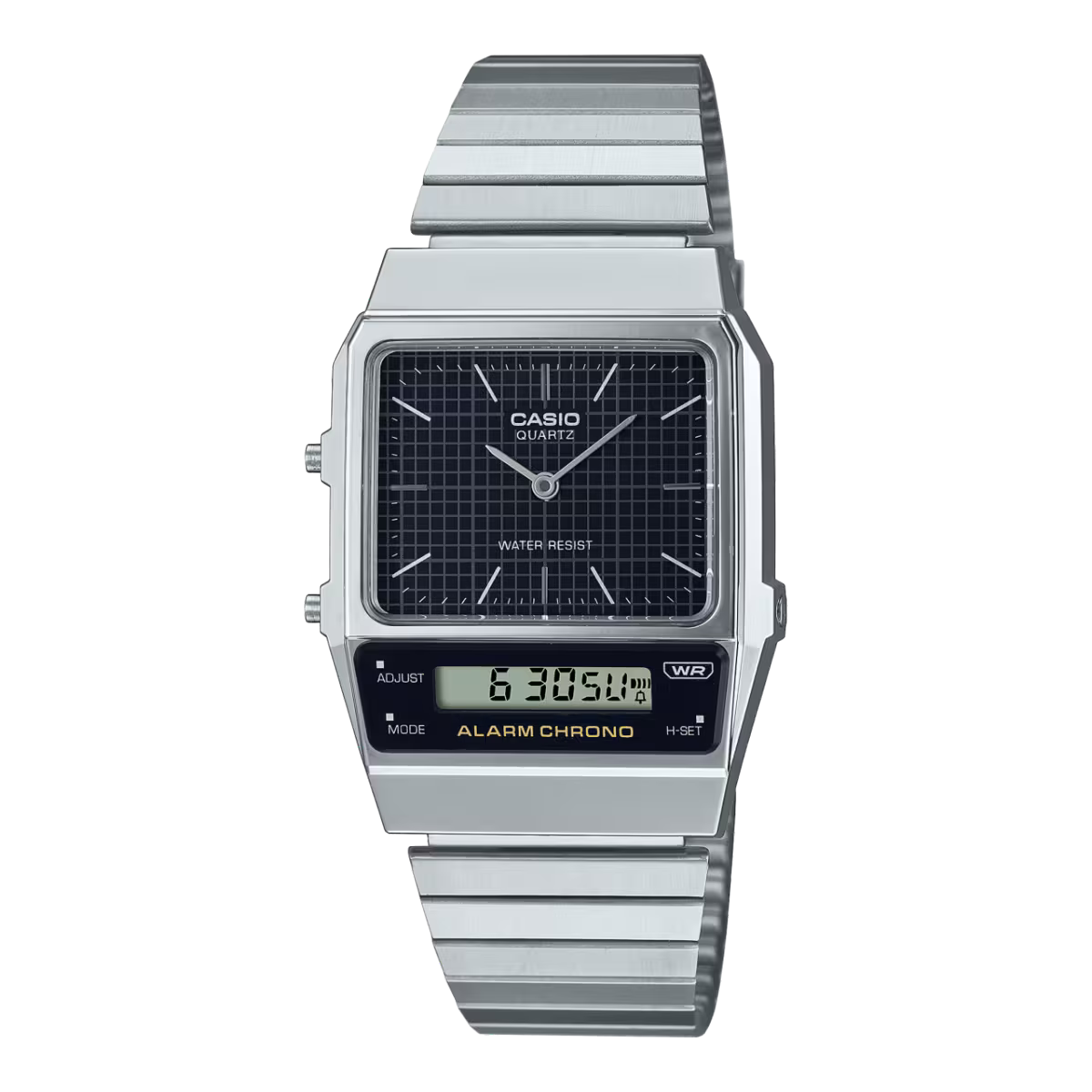 جدّد أسلوبك الكلاسيكي القديم مع تحديث عصري لتصميم AQ-450 من ثمانينيات القرن الماضي. هذه الساعة الجديدة كليًا، ذات الطراز الكلاسيكي، مزيج رائع بين الكلاسيكية والأناقة. ميناء منفصل وشاشة LCD يُضفيان جمالًا تناظريًا إلى جانب الأداء الرقمي. تنحني شاشة LCD بسلاسة لتتبع خطوط العروات، بينما يتميز الميناء التناظري بعلامات مؤشر شريطية بسيطة. يُضفي وجه الساعة المزين بنمط شبكي لمسة نهائية مميزة لشعور كلاسيكي حقيقي. يُجسّد الجمع بين العلبة ذات الزوايا والوصلات المستقيمة للسوار المعدني احتفالًا بسيطًا وأنيقًا بالجمال الهيكلي. أكثر من مجرد لمسة أنيقة، توفر هذه الساعات وظائف عملية مثل التوقيت المزدوج، وساعة الإيقاف، والمنبه، بالإضافة إلى مقاومة الماء للاستخدام اليومي لتُريحك من القلق، حتى في الأيام الممطرة.