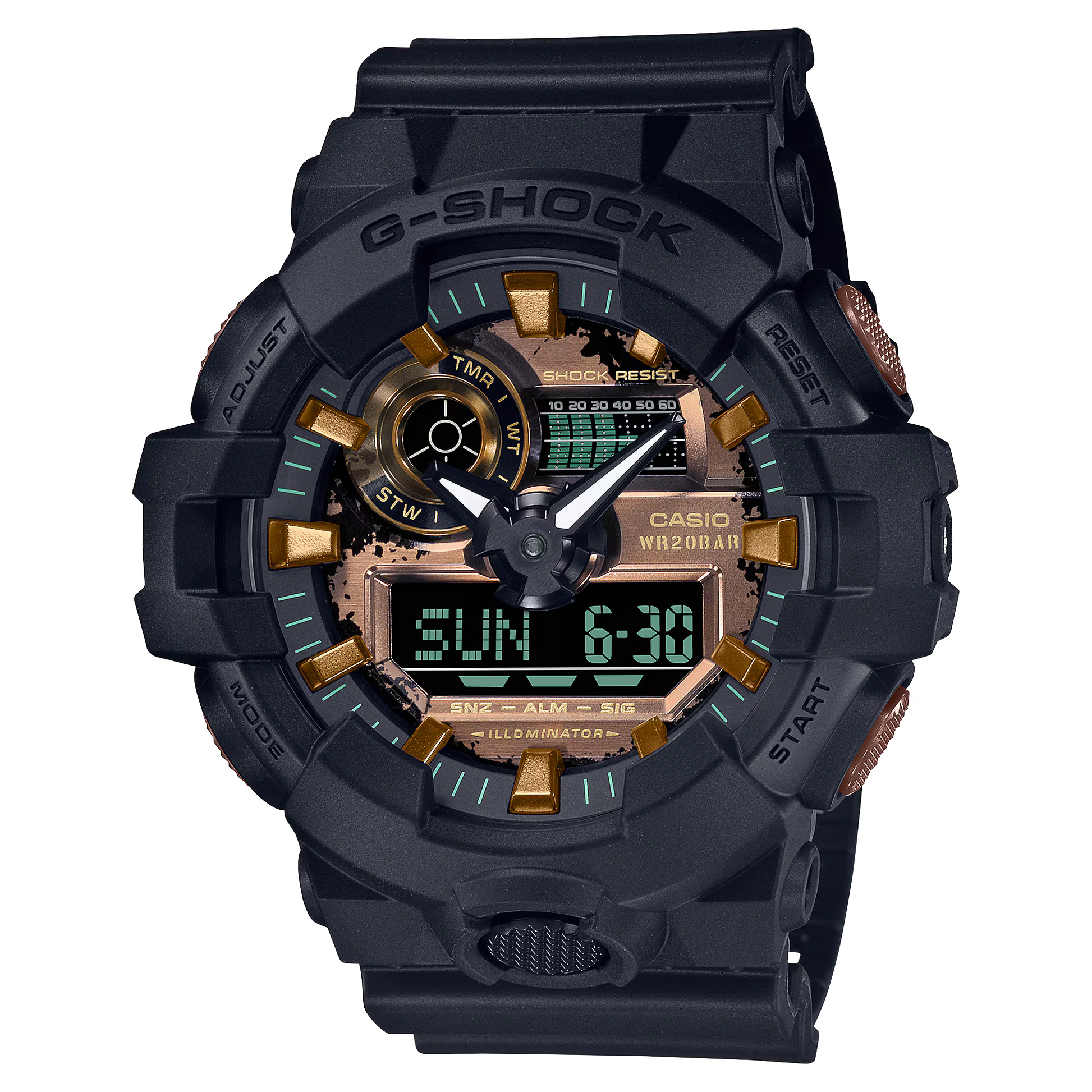 ارتقِ بمظهرك إلى مستوى آخر مع ساعة G-SHOCK بتصميم مستوحى من صدأ الحديد الذي لا يتأثر بمرور الوقت. تكرّم هذه الساعات سعي G-SHOCK الدائم إلى تحقيق أقصى درجة ممكنة من المتانة في تصاميم كلاسيكية وعصرية في الوقت نفسه باللون الأسود ولون الصدأ تذكّر بمظهر صدأ الحديد الجريء والصناعي. تتكامل درجات من البني مستوحاة من المظهر الخشن لصدأ الحديد بشكل جميل مع الخلفية السوداء. لمسات مميزة باللون الأزرق الفاتح لإضفاء مظهر خالد مع لمسات قديمة.