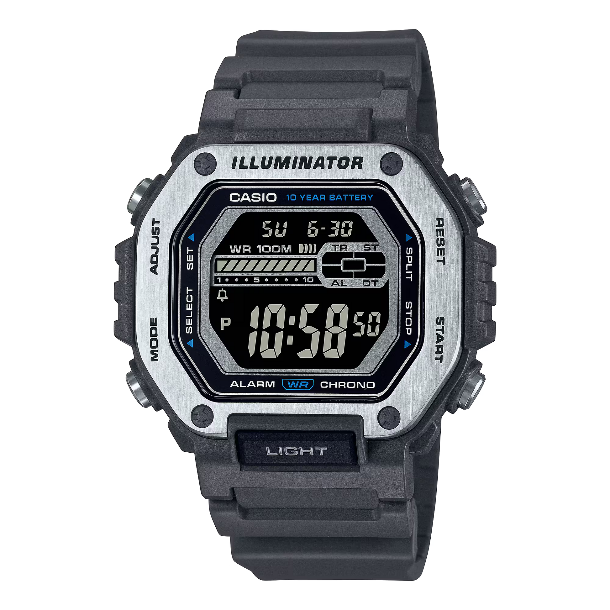 تميز هذه الساعات الرقمية، المزودة بمقاومة للماء حتى عمق 100 متر وبطارية عمرها 10 سنوات، بإطار معدني في تصميم زاوي جذاب. يتميز وجه الساعة كبير الحجم وسهل القراءة والاستخدام بإطار من الفولاذ المقاوم للصدأ بمظهر جريء ومتين. يسهِّل الزر الأمامي الموجود عند موضع الساعة 6 الوصول إلى ضوء LED. مزودة بمزيد من الوظائف العملية التي تتضمن ساعة إيقاف، ومؤقت عد تنازلي، ومنبهًا، وشاشة عرض التوقيت المزدوج.