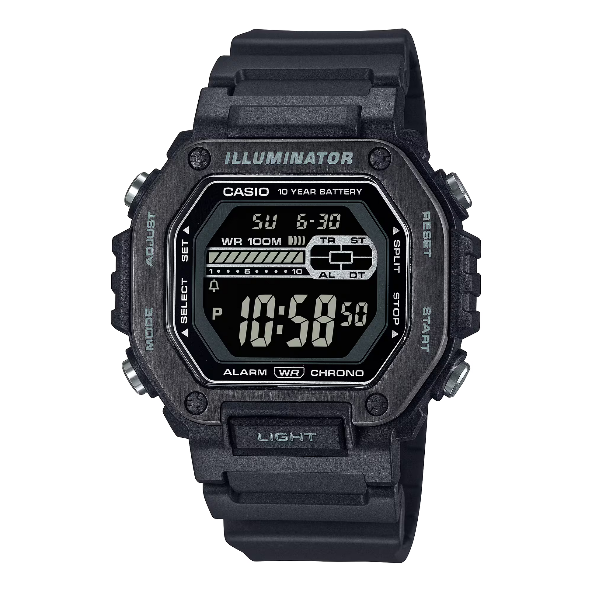 Delivering 100-meter water resistance and a 10-year battery, these digital watches feature a metal bezel in an angular eye-catching design. The oversized, easy-to-read, easy-to-use watch face is framed in the solid bold look of stainless steel. The front button at the 6 o’clock position makes it easy to access the LED light. Packed with more handy functions that include stopwatch, countdown timer, alarm, and dual time display.